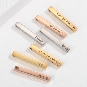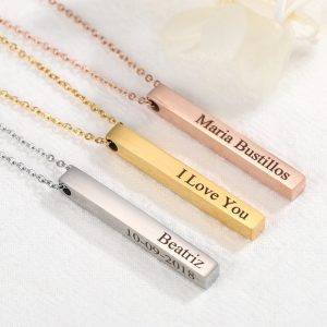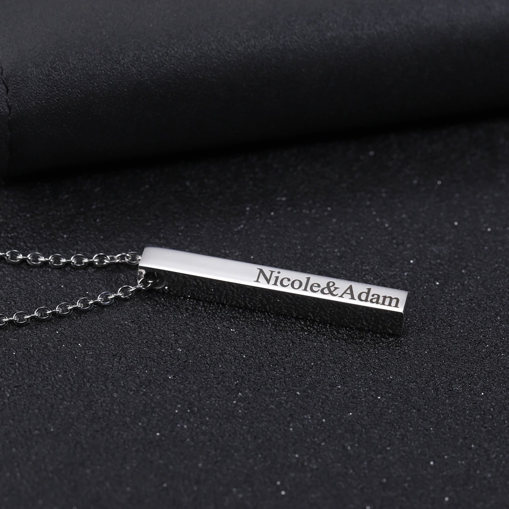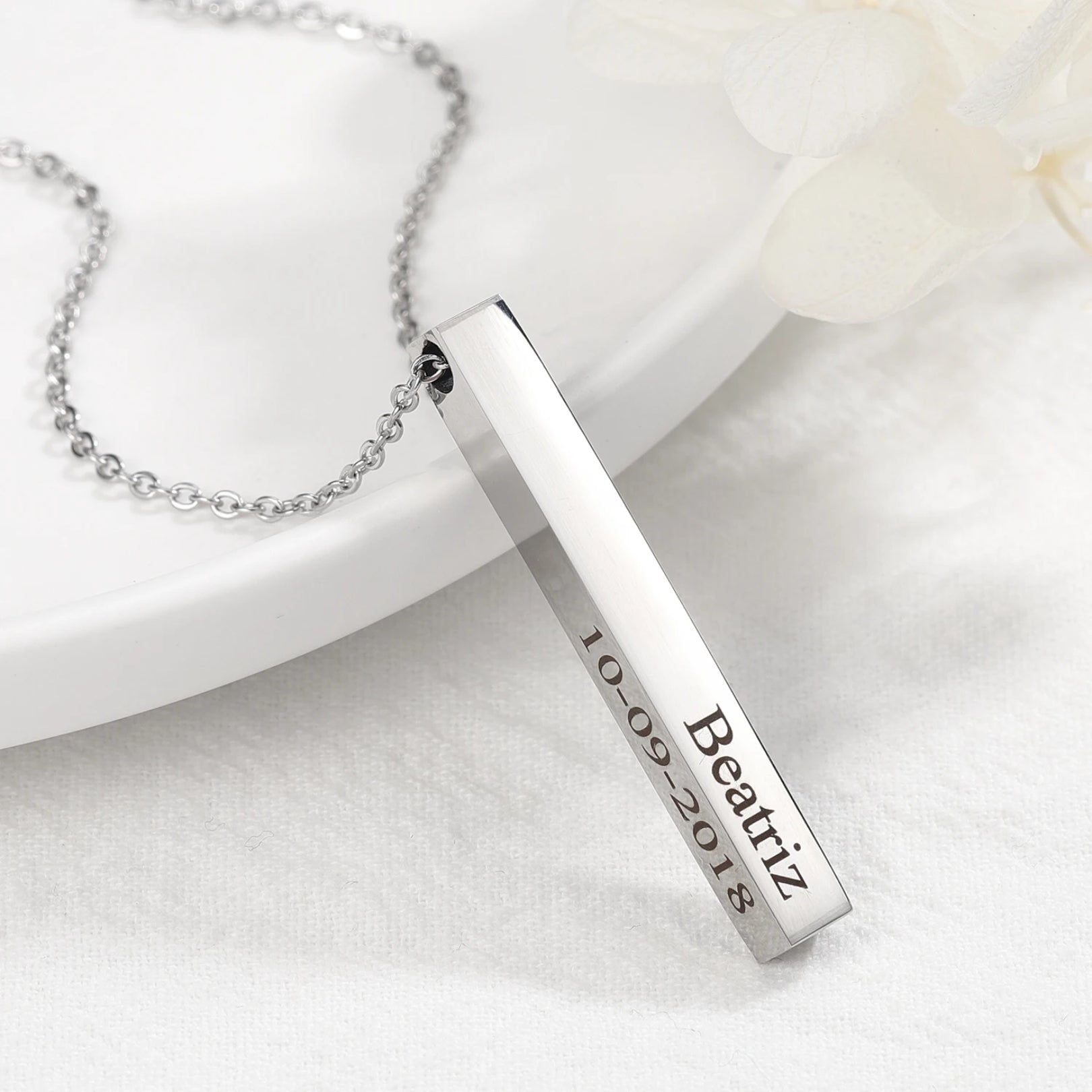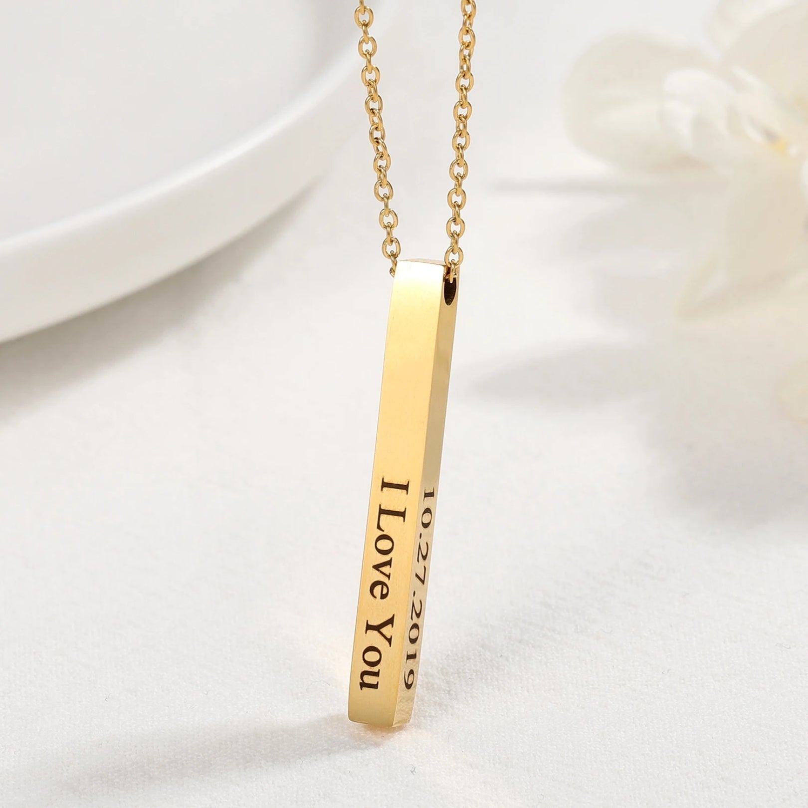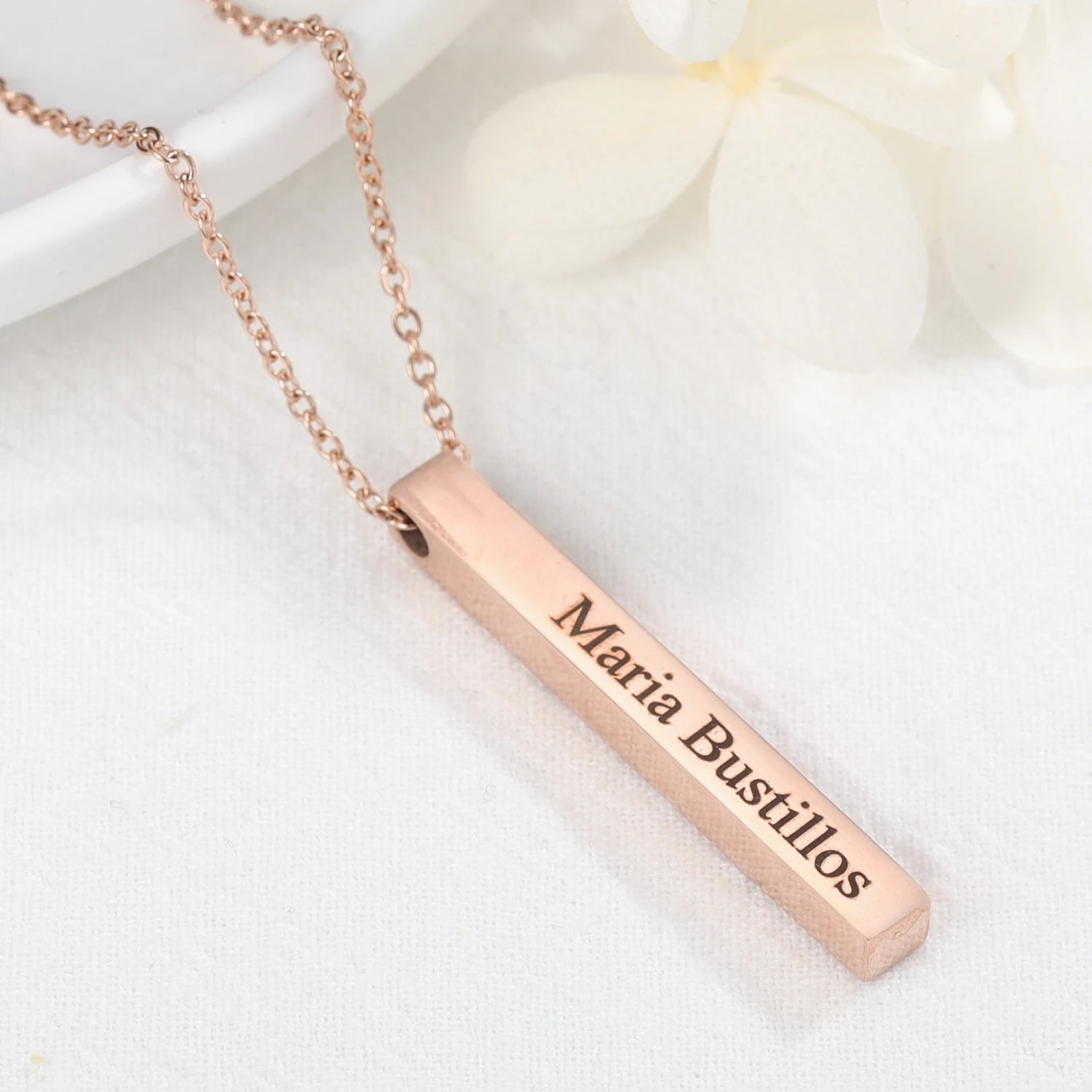 Our Custom Name Vertical Bar Necklace features a beautiful four-sided bar pendant. perfect for engraving up to four names. dates. or special words. This versatile design allows you to carry multiple sentiments close to your heart. making it a truly unique and meaningful accessory.